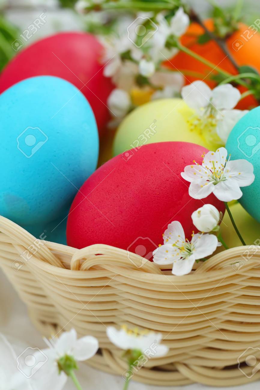 Oeufs Colores Et Fleurs Dans Le Panier Pour Le Dimanche De Paques Banque D Images Et Photos Libres De Droits Image 81834515